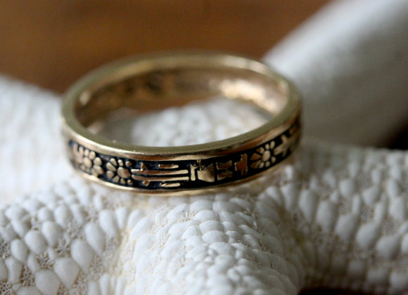 Men's 18K band in a two - tone finish with a decorative pattern throughout