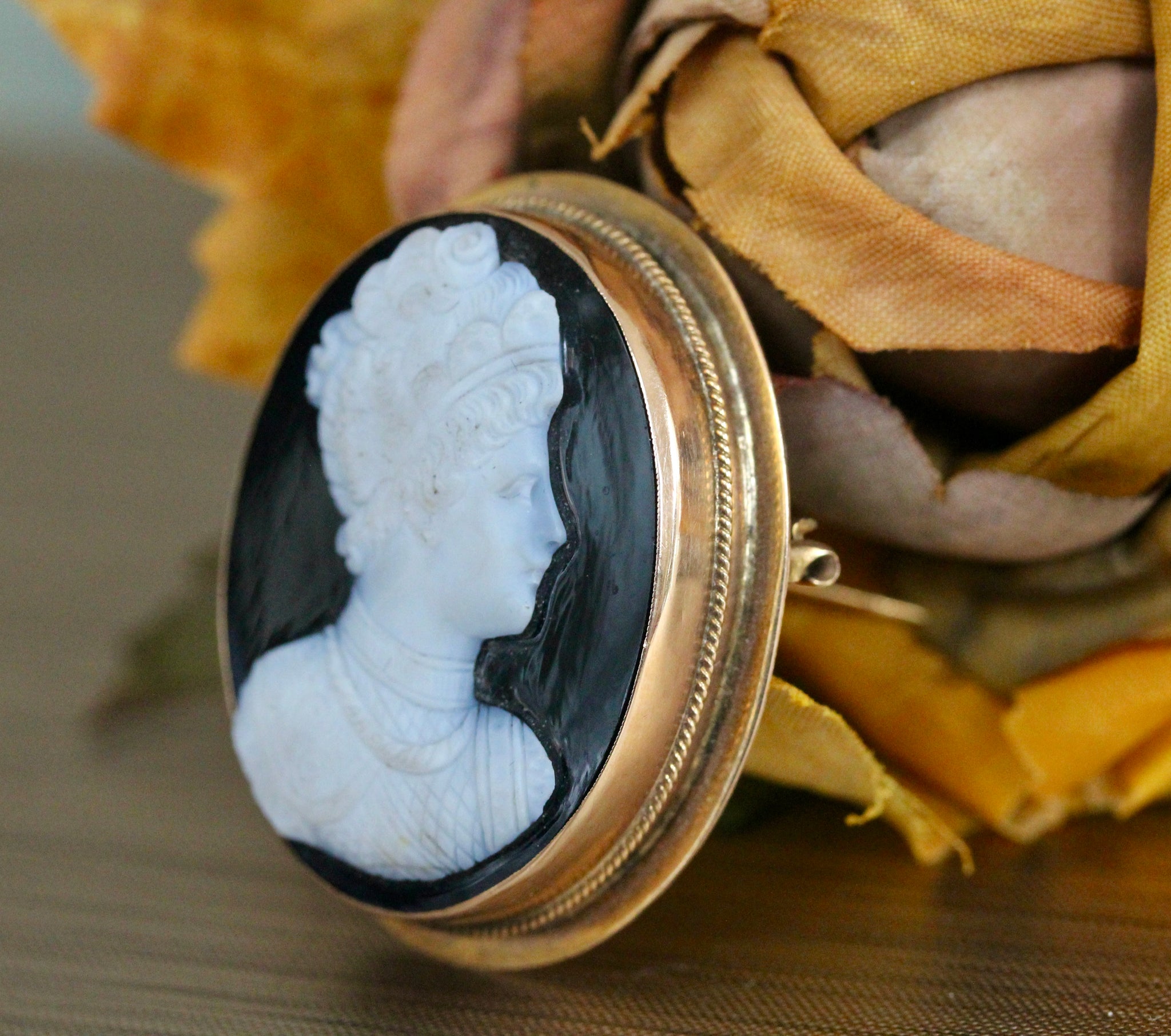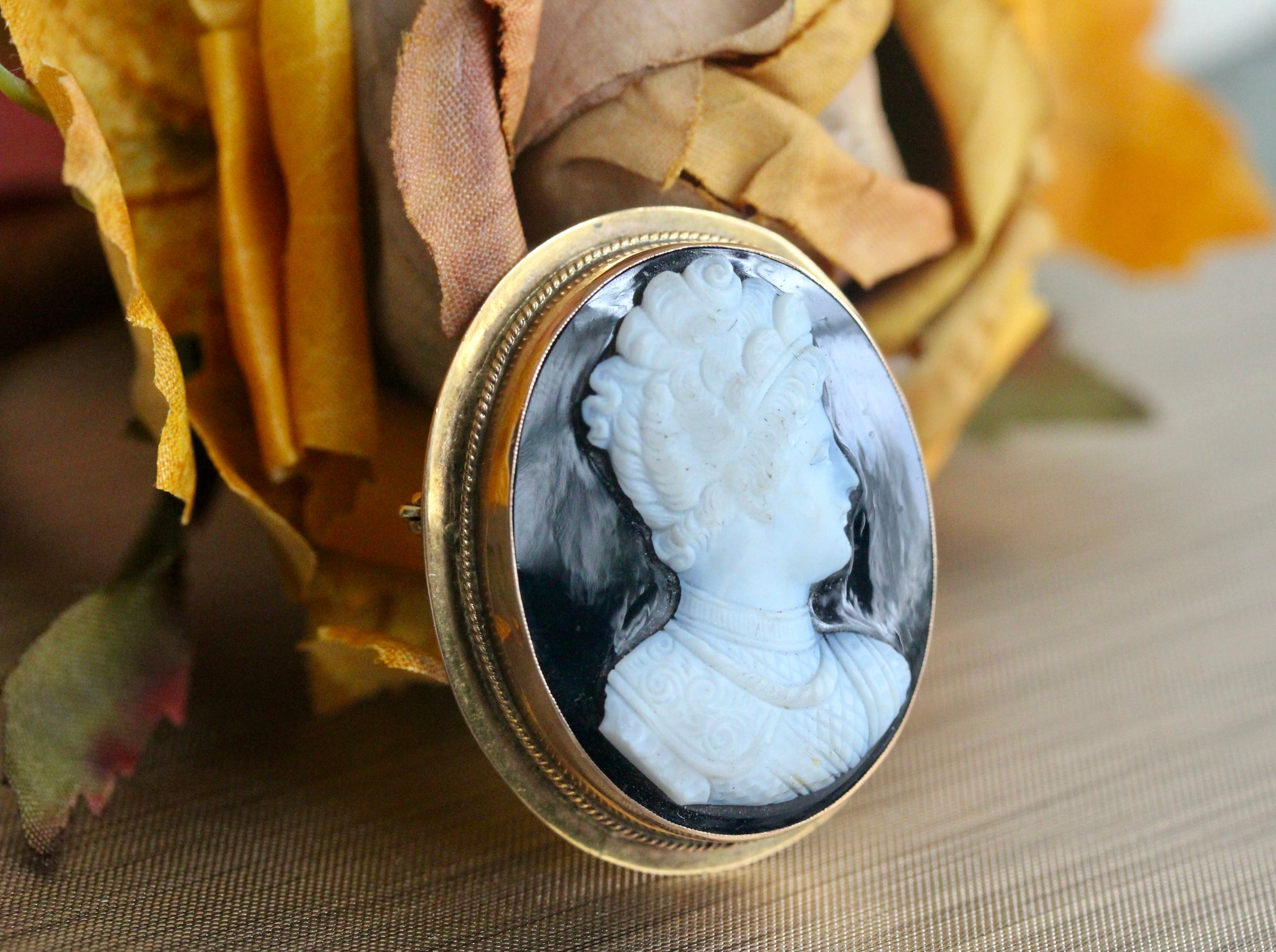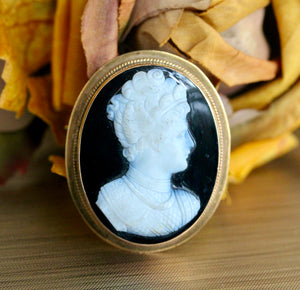 Stunning Black Onyx Cameo Pin with a decorative Gold border